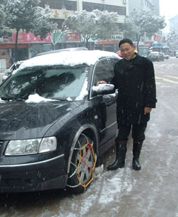 傅天明2008年冬天在建行办公大楼门前马上出发执行任务。