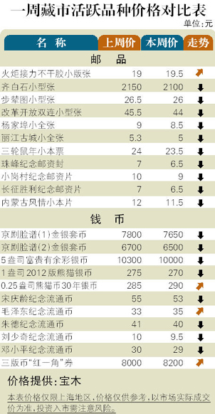 临近5月下旬,藏市走势仍然低迷,市场热点局促,成交萎缩严重,“歇夏”提前来临已是不争事实。邮市:热点品种在上半周下跌,下半周则反弹,可惜到了双休日再度回调,几乎乘了个来回电梯。“老邮”也出现回调迹象,其中“庚申猴”邮票价格跌至11000元,“红楼梦”和“从小爱科学”小型张分别滑落到1580元和12500元,与4月底相比,大量JT强势品种的跌幅在5─10%之间。币市:“熊猫金币发行30周年”1/4盎司银币货源急剧增加,价格下沉到270元附近,而新面世的“五台山”2盎司银币高开在1900元,但乏人问津,成交价旋即回调至1850元。