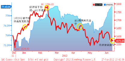 第三阶段:5月中旬至今,国际黄金价格在触及半年内低点1527.21美元/盎司后维持低位区间震荡,因6月美联储未能推出QE3令市场失望,同时欧债危机致美元被动走强,黄金始终未能有效突破1600美元/盎司。然而,6月最后一个交易日,欧盟峰会取得的重大进展令风险资产大幅上扬,欧元兑美元录得8个月来最大涨幅,黄金更是大幅上涨3%,是否能带动一轮反攻行情令市场关注。