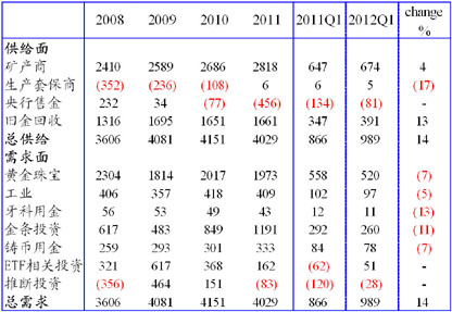 表1 2011年全球黄金供需情况(单位:吨)