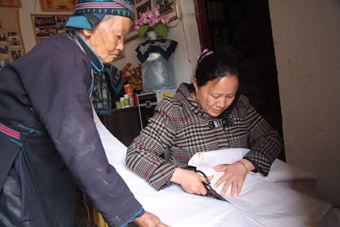于是,俩姊妹从联合国一个项目得到4000元无息贷款。杨莉拿到这笔钱先跑到市场去买苗族老人家织的花椒布,还买来大米,打算招集几个姐妹到家里来做活,午饭就在这吃,然后她像经纪人那样把产品卖出去。12个已婚姐妹听说农闲时可以挣钱,就报了名。在这个松散的合作社组织里,杨芳是蜡染工艺师,杨莉是刺绣工艺师,俩姐妹当起了技术指导。