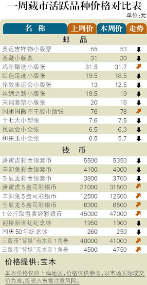走进9月初的藏市,并未延续前期回暖状态,随热点新品高开低走,市场回调重现,令即将到来的秋季市场走向变得扑朔迷离。邮市:8月末连续发行的“和田玉”和“宋词”新邮题材上佳,设计也可圈可点,但市场并不领情。好在JT“老邮”走势稳健,其中J7“农业学大寨”、T17“广阔天地”和T19“石油工业”套票分别微涨到70元、220元和95元附近。币市:“龙年”(贺岁)流通币公开发售,吸引不少藏家瞩目,但毕竟是一款天量级(8000万枚)品种,因此高开低走在所难免。此币发行之日为16元,但5天之后下沉至12元。估计随货源不断沽出,后市跌破10元整数关可能性极大,投资者需谨慎对待。