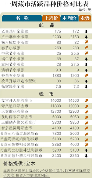 临近10月长假,市场的气氛仍然活跃,热点则维持9月中旬的格局,不少投资者和集藏者已试探性介入,令成交量继续温和放大。邮市:跌的状态没有变化,一些近年来发行的新邮创新低,如延边风情小版张跌至7.5元,无锡亚展双连小型张下滑到26元,而刘三姐小本票走低至4.2元。老邮中的庚申猴邮票走高到11000元上方,T100“峨眉风光套票上扬至55元。币市:龙年(贺岁)流通币价格回落,本周初跌至11.8元左右,五台山”2盎司银币价格则攀升到2150元,而青铜器金银币货源增多,市价下滑到5000元,5盎司银币跌至7300元。此外,熊猫30”1/4盎司银币继续在400元附近盘桓。
