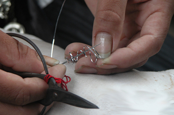 在苗寨,锡绣都是一代代手把手教出来的,当女儿出嫁时,母亲要将一套绣好的图案交给女儿,让其继承锡绣传统(图2)。锡绣完全依靠手工来完成,用剪刀将锡片剪下长约18厘米,宽约1毫米的细锡丝条,丝条拉直,一头打一小勾,另一头剪成针头状。把准备好的布垫铺在已绣有图案的棉布上,用针将图案的一根棉线挑出后,再用针头状的细锡丝条穿过已挑出的棉线,把打一小勾细锡丝条紧扣棉线,用剪刀把细丝条剪下,并将余下的细锡丝条反扣在棉线上,这样就完成一个扣锡过程。按棉布上的图案周而复始进行,也就形成了锡锈制品(图3)。