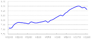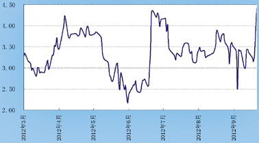 货币市场:由于国庆长假即将来临,市场流动性渐趋紧张,尽管央行净投放1010亿元人民币,7天质押式回购利率仍较前周上行107个基点至4.4277%