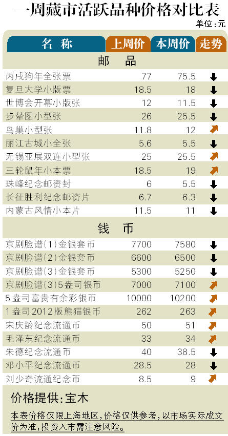 一周藏市简述 双节”长假市场明显遇冷,大多数邮商因藏市闭门谢客而无奈外出休闲度假,这也令交易出现短暂停顿。好在10月4日起,上海的“卢工”邮市率先开门迎客,到上周末藏市已基本恢复往日交易氛围。邮市:市场热点匮乏,绝大多数热点品种盘桓,涨跌参差。“儒林外史”小版张跌至18元,“唐诗三百首”套票小版张则小升到21.5元。第一轮生肖中的“己巳蛇”邮票遭遇吸纳,产品票色彩浓郁,价格已走高到4元附近。币市:金银币受到国际金银价格变化影响颇为显著,整体呈振荡回调之势。2012版“熊猫”1盎司金币微挫至11700元,而新品中的“五台山”2盎司银币货源增多,价格回调至1950元,“青铜器”金银币回落到4900元,5盎司银币则下滑至6700元左右。