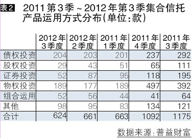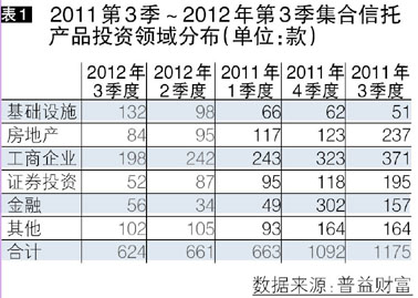 集合信托产品发行量连续三个季度保持低位:本季度有58家信托公司向市场推出产品,较上季度减少3家;共推出624款,较上季度减少37款。其中,中融信托50款的发行量虽较上季度减少10款,但仍稳居第一。集合产品发行继续下降的主要原因有两方面:一是,经济较疲软致使除房地产和基础设施外的其他领域融资需求有所下降,而房地产行业虽然融资需求相对旺盛,但因调控等原因,能通过信托融资的项目不多;二是,其他融资渠道特别是刚刚放松的券商定向资产管理计划,给集合信托带来较大竞争。(图1