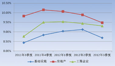 3季度,各领域集合信托产品的收益率均明显下滑,主要原因是货币政策放松以及基础利率走低。以两年期产品为例,基础设施类也结束了上季度逆市上行的趋势,收益率从上季度的9.12%下降至本季度的8.69%,降幅达0.43个百分点;房地产信托的收益率虽仍高于其他类产品,但仍较上季度也下降了0.41个百分点。另外,工商企业类的收益率也小幅下降。