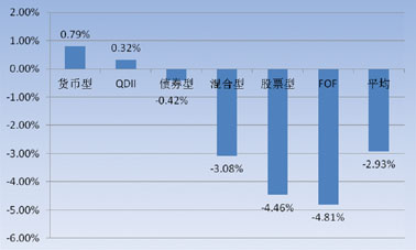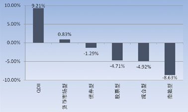 与券商集合产品一样,本季度公募基金的表现整体不佳,除QDII基金取得9.21%的佳绩与货币型基金录得0.83%的正收益外,其余各类基金涨幅均为负值。