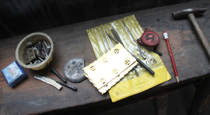 应广火做秤的小作坊就在自家的楼上,一张竹椅被磨得亮亮的,南方的气候溽热,做秤常常要坐上几个小时,椅子是竹条编的,很宽的缝隙,为了便于通风。应广火戴上老花镜,用缝衣针做成的手工钻在打磨好的秤杆上刻秤花。做秤的名堂很多,有十三四道:刨杆、下料、打眼,校秤、量步、锥星。民间有个说法叫五匠合成一个秤师傅,说的就是做秤是一门需要会全活的手艺。磨秤杆是木匠活,做秤钩和钮兜是铁匠和铜匠活。制秤毫是麻匠的手艺,最关键的刻秤花,也就是锥星则需要金匠的精准。而这五匠在应广火漫长的制秤生涯里,已经锤炼到炉火纯青的境界了。做秤的心思都在秤星上,应广火先把画好的秤花印在秤杆上,然后拿着铅笔样的小钻,根据花样的走势,钻出一个个间距细密的小洞,连缀起来就有了荷仙姑的模样,接下来就是金丝镶嵌了,这是最考验手艺的环节,材料贵是一方面,最紧要的是把细细的金丝准确地插进小孔,再用刀片平滑着切断它,留下一个个的星点,然后用小锤轻轻敲实,这个动作要重复几百次。而要在光滑的弧状杆面上完成如此精致的手工活,没有三五十年的功力是根本做不到的。秤花本是称斤两用的,但在应广火做的秤上却有了更多的妆饰意义,应广火设计的秤花有几十种,水浒、八仙、三国、十二生肖等,都是他多年积攒起来的。一枚秤花做好了,应广火摘下老花镜,用手摩挲着秤花,金丝在深褚色的秤面上闪烁着,星点的光晕有着妥帖的精巧,应广火的神情里有点满足。为了拍摄刻秤花的细节,同行的摄影师要求应广火再做个镶嵌金丝的动作,应广火又拿起了桌子上的钻头,一旁站着的儿子大概怕他累了,就小声提醒他,不用真的做,摆个姿势就好了。没想到,他突然发起火来,冲着儿子大声地嚷了起来,应广火生气了,他认为儿子在说他老了,做不动了。这让儿子有些委屈,站着不再说话。