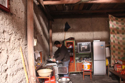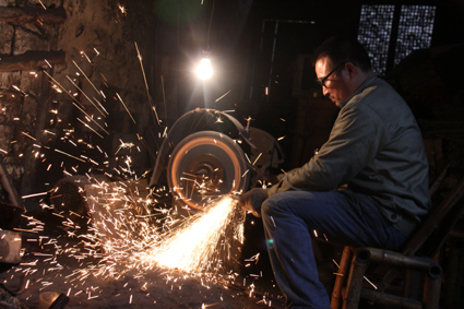 俞世仓拿起火钳,从炉火中夹出已经烧得红通通的铁块,放在铁墩上,一只手抡着铁锤有节奏地敲击,另一只手挪动着铁块的位置,很快,刚刚还方方正正的铁块渐渐就有了弯镰的模样,他停下手,虽说门外还是阴雨连绵,但俞世仓的额头上已经冒出了细密的汗珠,炉火映得他的脸有些泛红。他一欠身坐在了椅子上。走南闯北打了30多年的铁,他不知道,也从没想过铁匠铺之外的世界,岁月仿佛是停滞了,惟一让他感受到时光脚步的是,自己身体的衰老,虽说还不到50岁的年纪,但打铁是个体力活,早年间颠沛流离的生活过早地消耗了他的健康,打上一会儿就要歇上几歇。