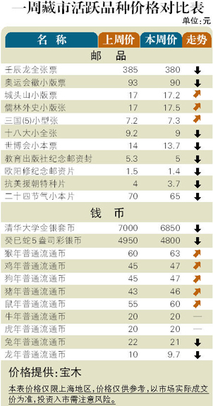 “十八大”小版张的不断上扬,令11月中旬的邮市呈现局部回暖迹象,尤其是近期热点邮品价格继续攀升,似乎在弥补秋季萎靡不振表现的遗憾。与此同时,币市再度踏入迎新节点,“癸巳蛇”生肖金银币的亮相,无疑成为岁末之前金银币板块的焦点所在。邮市:“十八大”邮票是近期邮市热点,但套票、小型张和小版张的表现有所分化,其中“十八大”套票和小版张分别攀升至10元和42.5元,而“十八大”小型张却小挫至9元。币市:“癸巳蛇”上市搅动币市池水,不过高开低走痼疾依旧,其中“癸巳蛇”本色金银套币和彩金银套币价格分别从2900元和3400元回调到本周初的2750元和3250元,“癸巳蛇”梅花型和扇形套币价格也分别微挫至13000元和5900元附近。