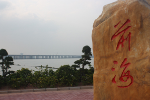 待双方交流完,我们将前往现场。目前,进入前海现场需要办理相关手续,我们看到,入口处有“边防警戒区内人员、车辆凭证通行”的标牌,并有武警守卫。这里的土地还是荒芜一片,有些地方集中种上了树苗,途径一处铁丝网,组员告诉我们,铁丝网的外侧全部是填海形成的土地。前海总面积14平方公里,可谓寸土寸金,除了填海,更高效的利用土地才是上策。据了解,前海的开发已经做了整体规划,计划总体投资2700多亿,地上是高层写字楼,地下有五层,铺设十一条干道,交通和餐饮全都安排在地下。组员带我们来到写有“前海”两字的巨石旁留念,并告诉我们随着工程的开展,这块石头不久将被运走。巨石所在位置紧挨大海,这是当年文天祥过伶仃洋的地方,远望海上小岛,那就是伶仃岛。而未来,这里将成为前海的休闲带。