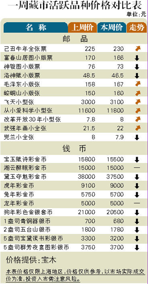 延续近一个月的邮市反弹行情,在上周末明显遭遇短线获利盘抛压,不少品种出现回调表现,估计此波反弹行将步入尾声。邮市:上周买气逐日萎缩,热点品种价格下调,其中“红色足迹”小版张回调至23元,一周跌幅达1成。第三轮生肖版张、双连小型张和丝绸小版张交易量快速下降。惟“产品票”傲视群雄,如1999年发行的“科技成果”套票飙升至25元,2个月内升幅达250%。币市:“癸巳蛇”金银币礼品需求徒减,显然与送礼者谨慎有关,但价格波幅有限,其中“癸巳蛇”彩银币价格从4800元回调至4600元,而“癸巳蛇”本色金银套币和彩色金银套币分别盘旋在3100元和3500元附近。另外,“壬辰龙”贺岁流通币价格下沉至8.5元。
