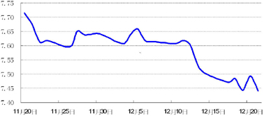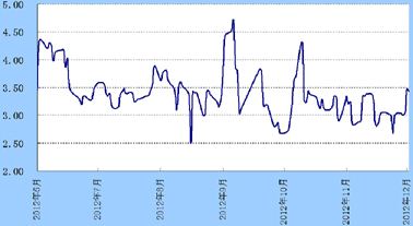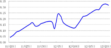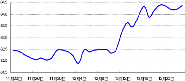 货币市场:因临近年末,上周市场资金面略有收紧,央行公开市场逆回购操作规模相应扩大至1680亿元,单周净投放资金920亿元,7天质押式回购利率较前周上行42个基点至3.42%。
