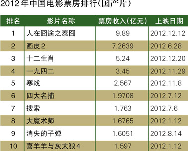 ■ 砂时计 从来没有一个年份像2012年这样,和电影如此紧密的相关着。2009年美国灾难题材影片《2012》一经上映,风靡全球。其引用玛雅历声称的“2012年12月21日地球将发生毁灭性灾害,人类社会将随之灭亡”的情节,在电影上映后一直弥漫全球。加之近年来金融危机蔓延,各国经济疲软,政治局势亦动荡不安,这一浓重的末世情绪因此广泛而深刻地影响了整个国际社会。在中国,无论真信也好,附会也罢,终归,这样真真假假或多或少的末日心理极大刺激了整个消费市场,电影消费更首当其冲。根据国家广电总局12月19日发布的数据显示,2012年前11个月中国电影总票房达141.5亿元,相较2011年全年的131亿元,有了大幅提升。截止2012年12月31日,中国电影票房进口片和国产片排名前十的影片基本确定。(表一、表二) 国产影片与3D 据报道,随着2012年进口分账片配额增加至34部,国内电影市场格局正在面临调整,今年前三季度国产影片市场份额仅占40%左右,跌至近年来同期最低,而今年全年国产片市场份额能否继续多年来保持的50%以上则还需要靠12月贺岁档的国产影片发力拉动。可以看出,2012年中国的电影市场依然是引进片优势明显,但在最强音里已经出现了国产片了。这其中《画皮2》堪称翘楚。《画皮2》的成功是多方因素共同成就的,而这其间尤以其在国内只以3D方式上映最为显眼。无论你愿意从哪个层面去评价这件事,但其背后代表了中国电影人已经完全把握并能很好地运用电影工业发展趋势带来的成效这一实质。3D电影自《阿凡达》起,便真正从电影表现形式的配角,化身和2D联袂主演之势出现在观众眼前。今年以来几乎所有进口大片都配有3D排片,动画电影更是几乎只以3D形式放映。而国产片也不乏前期就以3D形式拍摄的。去年《龙门飞甲》以国产3D电影先锋之姿狂揽5.5亿票房。《画皮2》更完全抛弃2D屏幕,借此一举登上全年电影票房宝座。可以预见,在此后,电影,特别是商业大片将更多以3D形式呈现观众眼前。而这一发展趋势对中国电影的观影设备提出了更高的要求,其实也为中国院线建设的更新换代以及电影相关产业的发展提供了契机。 超能英雄及中国元素 如前所述,末世情节两三年来一直在全世界范围内蔓延。这对电影行业的影响还表现在灾难题材和超能题材的持续升温。而这一效应在国内体现的更为明显。今年有两部之前上映过的灾难题材影片泰坦尼克以及2012经过3D重制后全球上映,而其中在中国的票房最为亮眼,泰坦尼克3D版更是拿下今年中国电影票房的头把交椅。在人类面对力所不及的灾难时需要被拯救的。所有理性外的超能英雄就这样应运而生了。西方人的思维一直是强调个人英雄主义,这与其社会扁平化民主化分工化,强调协作有着分不开的关系。与此同时,国人自古以来不讲求个人在集体中的出挑。但随着社会结构的不断稳定,个人性格教育亦趋向于体现个性、追求异化,加之今年甚嚣尘上的末世理念,国人对于外来的超能英雄们也体现出了几乎顶点的热情。今年好莱坞出品的超能类型的进口片在中国的表现也可圈可点,前十中与超能英雄或英雄类相关的占了七席,且票房表现力远超国产大片。正是鉴于此,很多这一类型的影片都在拍摄期间将吸引中国投资和增加中国元素考虑其中。已经上映的《变形金刚3》,《黑衣人3》,《环形使者》,以及正在拍摄的《钢铁侠3》等等都是如此。但就观众的观影体验来说,除去中国的投资,影片中的中国因素多少都有些牵强赴会,特别是一些植入广告,过于生硬,影响效果。怎样在吸引中国观众眼球又能很好融入影片整体效果中,这是制作者和投资者需要共同探讨的课题。 中国式类型片与其式微 此处所说中国式类型片是一种很难界定之后的模棱说法,主要包括了各种大导演们醉心痴迷的意图表达历史、战争、人性、命运等等复杂课题的各路古装大片。中国式大片是整个当代所有大导演或者说意欲成为大导演的导演们,心口永恒的朱砂痣。从张艺谋到陈凯歌,从冯小刚到陆川,不一而足。究其缘由,一是近年来很多行业外资金的大量涌入,而此类资金的投放,基本以所谓的国产古装大片为方向。许多片方为吸引投资,从立项到剧本、导演、演员等等都匆匆上马,且投资方对制作方的话语权增多,就演员、剧本甚至导演等方面的掣肘加剧。就电影艺术本身,这绝非好事。现实题材在过审时较之古装题材难度增加,因此也从另一方面导致大投资的影片集中在古装片。二是这一类型的片子在海外发行时更加吃香(但自去年以来,华语片海外市场急剧萎缩),特别是,在申报奥斯卡最佳外语片时更有竞争力。这一现象也是自《卧虎藏龙》夺得奥斯卡最佳外语片后,给华语电影添的一块儿心病,直接导致中国的导演们拍片时做的都是美国梦。其本质上,就不接“地气”,不是为中国观众而生的。那么这些说不清道不明的类型片本身在流失大量观众,甚至流失观众对很多导演的信心,也就不足为奇了。其实这一现象早在2011年就已出现,观众审美的疲劳在今年达到顶点,2012年上映的《铜雀台》、《王的盛宴》均前十不入,后者甚至不过亿,与其行销时主打的大投资,大导演、名演员等等比起来,票房表现乏善可陈。电影行业当然需要资金、导演、演员、技术等等大投入的商业大片,但如何将商业大片和民族题材很好结合,如何制作符合
