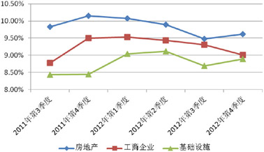 2012年4季度,房地产信托收益仍然最高,以2年期产品为例,房地产类信托产品平均收益率从上季度的9.48%上涨至9.62%,工商企业类信托产品平均收益率则环比下滑了0.30个百分点,基础设施类信托产品平均收益率则在上季度大幅下降后有所反弹,本季度上升0.20个百分点至8.89%。