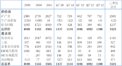 2012年前三季度需求总额3325吨,比2011年同比下降1%(表1)。供给方面,矿产金供给与去年同期持平,生产商套保由正转负,旧金回收量仅比2011年同期减少4吨。通常金价上涨时旧金回收量同步上升,2012年前三季度金价上涨超过10%,旧金回收量未同步增加预示第四季度市场对金价上涨预期不强。