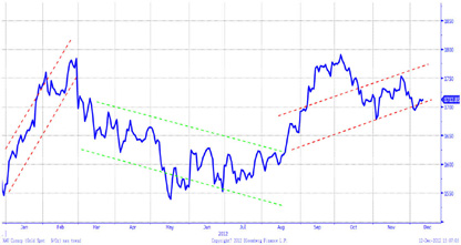 第二阶段:3月至8月,希腊债务问题爆发,欧元区其它成员国的债务问题愈加凸显;美联储内部对货币政策分歧仍未得到解决,市场对QE 3的预期几次落空;中国调低经济增长预期,印度提高黄金进口关税等因素均对市场造成较大压力,黄金价格从2月份的1784.24美元/盎司一路下行至1600美元/盎司,并延续弱势盘整数月。