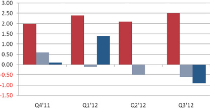 2012年美国经济呈N型缓慢增长。前三季度GDP增长率分别为2.4%、2.1%、2.5%,高于上年1.8%的平均增长率,PMI指数在年中触底回升。房地产市场方面,在美联储推出QE3后,超低的融资利率刺激了房地产需求回暖,新屋销售和房价数据均得到改善,第四季度房地产市场已现巩固复苏迹象,并将在中长期成为推动美国经济增长的主要因素。物价方面,虽然大旱天气影响了农产品价格,但同时疲弱的全球需求抑制了能源价格上行空间,总体美国通胀温和,全年CPI保持在2%目标水平以下。就业方面,全年失业率仍然维持8%左右高位,离联储6.5%的目标值差距较大。从行业看来,和2007年10月份美国就业市场繁荣时期相比,建筑业和制造业就业人数还有较大差距。在房地产市场复苏的大环境及制造业继续下行风险有限的前提下,预计2013年美国就业市场将随着房地产市场的好转出现明显改善。