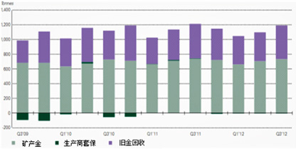 2012年全年矿产金供应基本无变化,截至第三季度,全球矿产金供给总额2101吨,上年同期2108吨。传统产金四国(南非、澳大利亚、美国和加拿大)6-12个月前投产的项目并未如期大幅提升金矿产能。南非矿产金供给受罢工潮影响较大,据彭博社报道,罢工潮影响了南非39%的黄金产出,即全球约4%的金矿产量受损。同时,中国、秘鲁和墨西哥的矿产金继续增加。值得注意的是,2012年矿产金供给增加的多为中小金矿,前十大金企中仅有三家(Harmony Gold、Polyus Gold和Navio MMC)供给增加,且其中两家的增加仅仅是因为兼并其它金矿而非内生增长。
