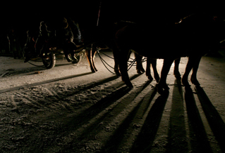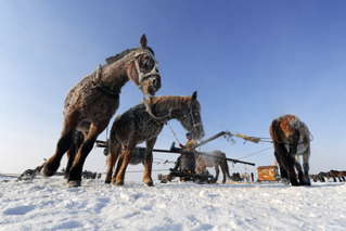 搁往常,一般都是凌晨4点多下网,到下午2点左右起最后一网鱼,一天的捕捞就结束了。今天不行,为了配合大典结束后游人观摩起鱼的盛况,渔工们夜里两点就坐着马车赶到湖里来下网了。天还是乌黑一片,前几天就有个渔场的渔工掉进冰洞里了,电视上都播了。这事儿搅得张把头的心里一直不得劲,毕竟谁摊上这个事都不乐意。安全第一。天太冷,喝上口烈酒驱驱寒气,渔工们坐着马车往湖里赶,车轮轧在雪上,吱嘎做响,冰缝子在雪薄处咧着小嘴,看得人胆战心惊。马鼻子呼出的白气,一团一团的,在黑暗中汇集、移动、消散,万籁俱寂,查干湖还没醒呢。据说坐马车上湖是冬捕的规矩,听把头讲一是为了减少污染,再有就是不惊动湖里的鱼群。到湖上干活的渔工大多是渔把头雇佣的,不是渔场的正式职工,干一天活拿一天钱。老郭也在车上,他身份不同,是渔场的职工,跟着渔工下网,主要起监督作用,渔工们只要不偷懒,他就在旁边袖手站着。60年代的时候,查干湖成立了渔场,捕鱼成了公家的买卖,渔民们成了拿工资的渔场职工。从老郭的爹开始,老郭一家就靠着渔场生活,春天下苗,冬天撒网,日子还算安稳。和这些打零工的渔工们比,老郭知足,毕竟在不捕鱼的日子里,他不用考虑生计问题。特别是查干湖成为吉林省著名的渔业生产基地以后,严格的捕捞制度使查干湖兴旺至今,相关产业也逐渐发展起来,渔场工人的腰包也是越来越鼓。对于渔场的工作,老郭说不上喜欢,从小生于斯长于斯,生活从来就不是选择。