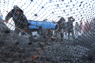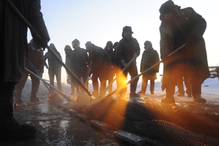 下网前的关键在于定位。前一天,由经验丰富的渔把头判断选择鱼群聚集的地方,围着鱼群凿出多个小冰洞。为了保证时间,渔工们常是在凌晨时分就坐着马车去湖里下网了。将大网通过相隔60多米的冰洞,用传杆、扭矛和走钩在冰层下慢慢舒展成一个硕大的“包鱼圈”。网太重了,只能把渔网前头的粗绳挂在绞盘上,由马来拉动绞盘,带着渔网前进。挂着冰霜的马围着绞车转圈,巨大的网从冰洞中一点点的爬升,沿着一条直线匍匐前进,渔工们就用手中的钩子将出水的渔网向两侧摊开不停地翻动着。鱼群你拥我挤,这样的一网往往就能打出几十万斤的鲜鱼。