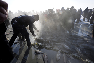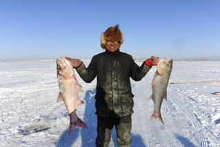 远处的鼓点停了,五颜六色的人群簇拥着往湖心赶着来看起鱼。张把头指挥着拉网的渔工,渔网从冒着热气的冰洞里一点点地往外爬,走走停停,像是要被肥鱼挤破了,游客们争相惊叹着,渔工们淡定地拉着网,有一搭无一搭地开着彼此的玩笑,商量着待会去哪儿喝酒。张把头向远处负责绞盘的渔工挥着手,老郭还站在雪地里,大红手套煞是耀眼。鱼群铺满湖面,售鱼的车就停在不远处,南下广东,北上京城,体验生活的游客们带着满足,不枉此行。