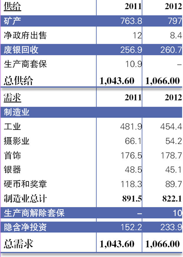 白银供给略有增加。2012年的矿产量维持了已经持续十年的增长势头。不仅如此,废银供给还创出历史新高,主要原因是印度的首饰和银器回收增加。因此,白银供给与制造业需求之间的缺口有所扩大。这个缺口由白银投资者来弥补,凸显出白银价格更易受到投资者情绪的影响。(表1)