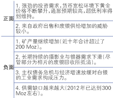 长期而言,我们认为商品价格最终将回归基本面。表2总结了2013年影响白银价格的正面和负面因素。供需缺口的存在以及高库存,令人担忧白银的上涨是否具有可持续性。当前支撑价格上涨的因素主要来自于投资需求,一旦全球货币宽松周期结束,白银的长期牛市有可能就此终止。投资者应注意其中的风险。