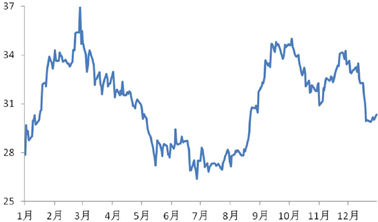2012年白银价格呈M型振荡走势,开于27.84美元/盎司,收于30.35美元/盎司,全年上涨9.02%,最高37.19美元/盎司,最低26.12美元/盎司。前三季度贵金属走势为美联储货币政策预期所主导。1月美联储决定维持超低利率至2014年底,远长于预期,白银价格上涨并创下全年高点。2月底伯南克在国会证词中对QE3只字未提,白银转为下跌趋势,6月底见全年低点。第三季度在欧洲央行OMT和美联储QE3的推动之下白银重
