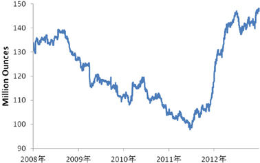 2012年末,ETF总计持有白银608 Moz,较2011年增加52 Moz,同比上升9.37%。上半年持仓基本持平,主要的增仓来自于下半年。随着各大央行纷纷采取新的货币宽松政策,白银作为抗通胀资产之一受到投资者的青睐,于是持仓量节节上升。