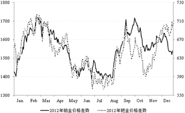 图3 2012年铂钯价格走势 单位:美元/盎司
