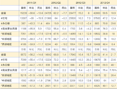2012年商品房及住宅销售面积和金额逐季增加,均在创历史新高。全年全国商品房销售面积111304万平方米,同比增长1.8%,商品房销售金额64456亿元,增长10%;住宅销售面积98468万平方米,增长2.0%,住宅销售金额53467亿元,增长10.9%。(表5)