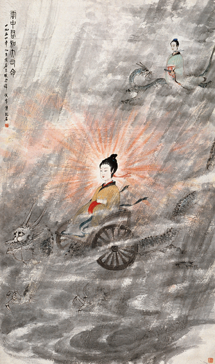 傅抱石 云中君和大司命 1954年作 镜心 设色纸本 223×133cm 钤印:抱石之印、踪迹大化 题识:云中君和大司命。一九五四年九月,据屈原赋今译试写。傅抱石。