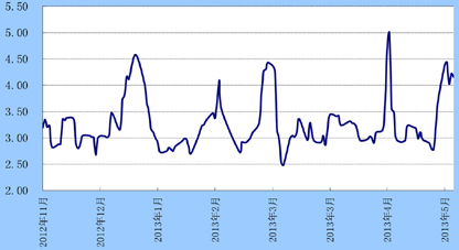 货币市场:上周,为缓解近期银行间资金紧张态势,央行公开市场净投放1280亿元人民币。尽管央行操作规模明显收缩,但仍坚持央票发行和正回购并举,此向市场传递了中性货币政策基调延续的信号,7天质押式回购利率较前周大幅上行46个基点至4.16%。
