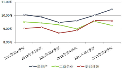 2013年第2季度集合信托收益率涨跌互现。分月来看,先抑后扬。本季度初,市场资金面相对充足,即使出现了债券市场的清理整顿,市场资金仍然相对宽裕。许多房地产商开始重新获得银行贷款,或者准备谋求股票市场融资。故一直到5月下旬,整个资金市场较为平稳。5月底,由于月末因素,资金利率有一波明显上涨。6月份,在政府调控转换的过程中,资金面骤然紧张,但对集合信托收益率的影响不大。以主流投资领域2年期产品为例,房地产领域平均预期收益率上涨44.42BP至10.46%,工商企业和基础设施领域产品平均预期收益率分别下降30.15BP和2.5BP至9.26%和9.60%。