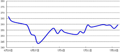 债券市场:上周,虽流动性已逐步回归正常态势,但由于中国宏观经济预期不甚明朗,再加上中长期品种一级招标结果亦不理想,带动二级市场长端抛压较为沉重,银行间债市现券走势较为疲软,收益率震荡走升。相应中债总财富指数下降0.31点至145.14。