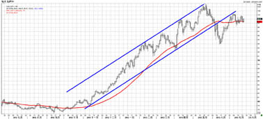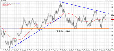 从周线图来看,欧元处于下跌的楔形整理,表明欧元长期处于下跌走势,欧元今年两度试探200周均线均告失败,目前该线在1.34附近。从日线图来看,欧元一旦跌破1.2750的位置,同时也是61.8%回调位,之后很可能会跌向1.20。