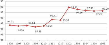 4-6月份,国房景气指数分别为97.35,97.26和97.29。虽然还处于不景气区间,但较2012年下半年则明显进入了一个趋于活跃的指数平台上。(图1)