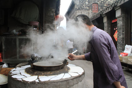 根据《梦溪笔谈》记载:炉丈八十,人入炉中,左右贴之,味香全美,乃为人间上品。这就是泰州的草炉烧饼。慕名来买烧饼的外地人,未必是多稀罕这饼的味道,多是看了网上的资料,有点好奇来现场参观一番。王家经营烧饼已经传至第五代了,烧饼的配方和工艺依然原汁原味地保留下来,没有改变,烤烧饼的师傅光着上身钻进炉里,挨个把做好的烧饼贴在炉壁,一边贴,下面炉里的稻草还在燃烧,这是个危险的细活,弄不好会被烫伤,这可是老辈子传下的方法,祖宗之法不可变?不是,只是一旦改变烧饼就不是那个“味”了,老泰州人就喜欢“这一口”。与其说是老泰州人好吃这一口,还不如说老泰州人喜欢这一种不变的生活方式,有条不紊地,按部就班地进行着,这草炉烧饼里有泰州人熟悉的寻常生活。