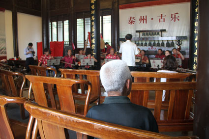戴德刚退休前在文化馆工作,现在是泰州凤城河文化演艺公司古乐团的指挥,赶上有演出的日子,他都会准时来到位于望海楼旁的文会堂,他们的团队多是退休的老人,也有年轻人,乐队中最年轻的是二胡演奏员蒋鹏飞,他是凤城河开发区管委会的员工,今年24岁。“他们原来从事着不同的工作,干什么的都有,也不都是搞音乐的,我也是半路出家,因为喜欢,大家就在一起弄。”戴德刚说。