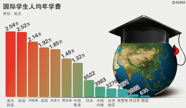 加拿大汇丰银行在对全球13个热门留学国家和地区前10所大学的国际学生学费情况进行调查后发布了一份调查报告。报告显示,国际学生人均年学费最高的是澳大利亚,约2.54万美元;最低的是德国,约635美元。美国在排名中位居第二,其国际学生学费与澳大利亚相差无几,约2.52万美元。图/CFP