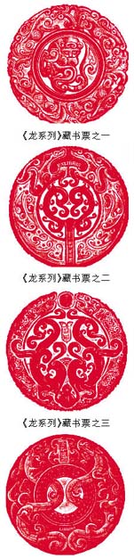 二○一二年,在上海“梅园杯”国际藏书票双年展上,上海版画家徐龙宝展示出一套《龙系列》藏书票,吸引了观众的眼球。这是至今第一次以龙为主题的系列组票。作者为上海大学美术学院教授,上海美协版画艺委会副主任,他的《青铜》曾获全国第六届版画书票展金奖。《龙系列》藏书票计十八枚,红色圆型。画面全部以龙构图,饰以其他小动物,刀法细腻,技艺精湛。
