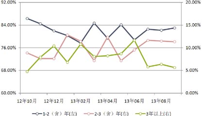 本月所有银行理财产品的平均(最高)预期收益率为5.01%,较上月上升0.30个百分点。从不同期限类型角度来看,受到产品类型多为结构性产品而定价与市场资金面形势相关性不大的影响,1年以上产品的平均预期收益率出现小幅下滑。除此而外,1年以下的各期限类型产品的平均预期收益率均不同程度上升,上升幅度均在0.25个百分点之上。受季末因素及国庆大假的影响,银行间市场资金面于本月内表现为逐步紧张之态势,这点从本月银行理财产品的预期收益率定价也能够看出,3个月以下的各期限类型产品的平均预期收益率均超过5%。此外,1个月至3个月(含)期产品的平均预期收益率环比上升幅度最高。(表1)