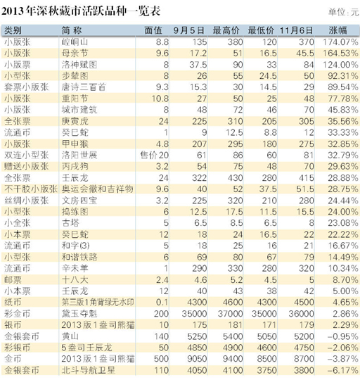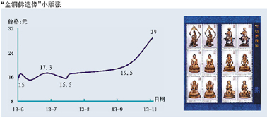 另外,今2013年发行的“母亲节”和“金铜佛造像”小版张也出人意料地分别大涨至45.5元和28元,而“景泰蓝”、“雷锋题词50年”、“桃花”、“中国古镇”和“琴棋书画”小版张则分别盘旋在15.8元、21元、23.5元、18.5元和25.5元附近,前些年发行的“梅兰竹菊”、“福禄寿喜”、“红色足迹”、“关公”和“行书”小版张分别上攀到36.5元、46元、23元、36元和82元,“资本市场”、“丝绸之路”、“草书”、“古代书院(2)”和“楷书”小版张分别回升至50元、15元、49元、16元和31元。