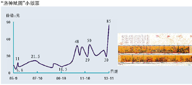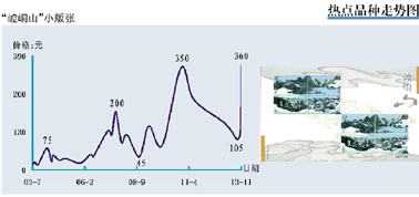 此外,古典名画小版票出现了大幅回升表现,“富春山居图”、“神骏图”、“洛神赋图”和“清明上河图”分别反弹到150元、85元、83元和60元,其中“清明上河图”小版票的价位已升至2011年初水平,而“洛神赋图”小版票则因在“南京文交所”挂牌上市交易,创出了发行以来的新高。