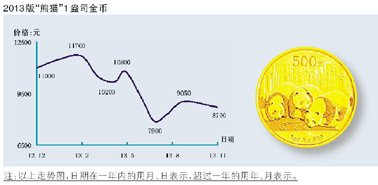 此外,近年来发行的金银币依然处于小幅盘旋状态,其中“黄山”金银套币徘徊在5200元附近,1公斤银币和5盎司金币的市价分别下滑到11700元和86000元,“普陀山”金银套币下跌至5000元左右,而“青铜器(2)”金银套币微挫至3300元,5盎司银币下滑到6000元。另外,“航母‘辽宁舰’”金银套币回升到7150元,“辛亥革命”、“青铜器(1)”和“五台山”金银套币分别跌至3950元、4000元和5000元附近。