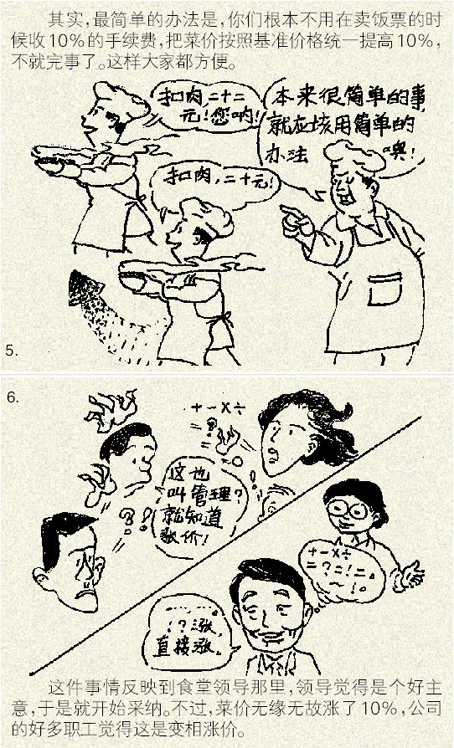 这个故事解读了增值税和个人所得税。两者虽不相同却又实质相似,相似是因为最终都是对收入征税,只是交的时间和环节不同罢了。买饭票时缴手续费,就像个人收入所得税,在拿到收入的同时就把税缴了。另一种对收入征税的方式是,在用钱的时候征收,也有两种方式,复杂的方式是在每一笔交易发生的时候都额外收税,这就是销售税。简单的方式就是在生产环节征税,这就是增值税,税最后转嫁到消费者头上就是价格上升,就像王二公司的食堂一次性提价10%那样。