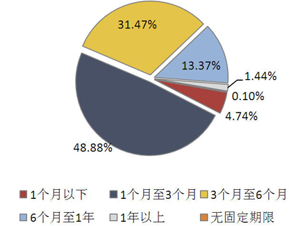 从投资期限来看,1个月(含)以下期产品发行了184款,较上月增加55款,市场占比上升0.68个百分点至4.74%;1个月至3个月(含)期产品发行了1898款,较上月增加274款,市场占比下降2.21个百分点至48.88%;3个月至6个月(含)期产品发行了1222款,较上月增加283款,市场占比上升1.93个百分点至31.47%,6个月至1年(含)期产品发行了519款,较上月增加79款,市场占比下降0.47个百分点至13.37%;1年以上期产品发行了56款,较上月增加12款,市场占比上升0.06个百分点至1.44%;无固定期限理财产品发行了4款,较上月增加1款,市场占比上升0.01个百分点至0.10%。(图3)
